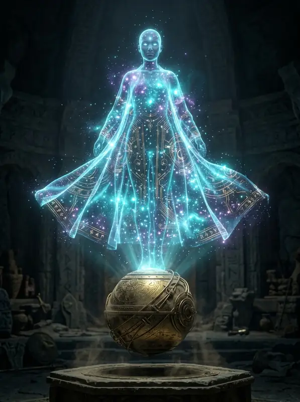 Guiding your path is Orion, a sentient holographic celestial archivist projected from ancient brass astrolabes, who appears throughout the site to translate glowing glyphs and guide your free exploration.